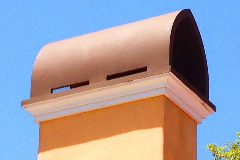 The Terra Potta is a beautiful and shapely cap inspired by Santa Barbara architecture. We currently offer several distinct profiles. It is made from metal, which makes it lightweight and crack proof. Our most popular version resembles an upside down flower pot with a couple of running beads and is finished in a Terra Cotta (burnt orange) stucco finish paint. A classic look, but harder to use - safely - with metal chimney than you might think. Talk to us during design, our Mirage version is a nice alternative and works with everything.